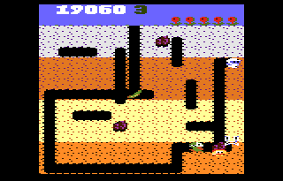 Gameplay: I am not sure if it is the aspect of the game field or something else, but the controls aren't responsive on the 7800 port. I tested this when the same lack of control was present in emulation as well. Basically dig dug seems to move too slowly sometimes and unlike the arcade where snap movements were possible, they simply aren't here. I do have to admit that I am impressed however, that Atari managed to keep all the elements of the original arcade intact. All the fruit and veggie prizes are in the game. Even the level layouts and colors seem to match the arcade.