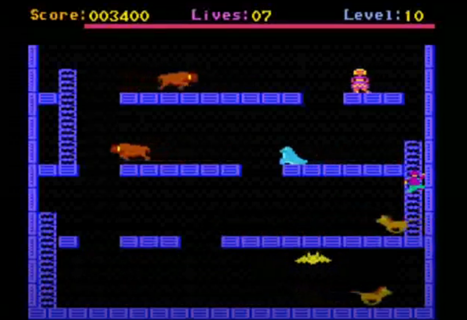 meat meal. Random, magical nets are your only power up, and when you finally grab one, touching an animal with it sends it back inside the walls. CRIME DOESN'T PAY! Animal Keeper is very addictive, and before you know it you've sunk several hours into it and missed your review deadline (sorry Funk). It is slower than Zoo Keeper, which I honestly prefer. AK does not attempt to follow the level design of ZK, and the platforming levels are vastly different. Zoo Keeper's bonus levels are like that terrible jumping mini game from Swordquest Earthworld (Atari 2600), and Animal Keeper's is more like a very basic, single screen Lode Runner (Amiga, Atari XE). To be honest, both are the worst parts of their respective games. But for as much fun as the simple gameplay of the main game is, there are some technical flaws I can't ignore. For one, if you lose all of your lives and choose to continue from where you left off at the menu, the bonus levels go away perminately. This may be a good thing if your not a fan of them, however. The whole game can feel like it's moments from crashing completely, it's jittery and glitchy, although the game has never crashed on me. The screen flashes like crazy as the action suffers slowdown, and then the animals will start behaving oddly. They appear as though they are inside the cage but sudenly snap back to the perimeter unexpectedly. And getting stuck on corners is going to happen. But if you take the good with the bad, I've found that the fun and addictive gameplay trump these issues overall (plus these issues are fairly infrequent).