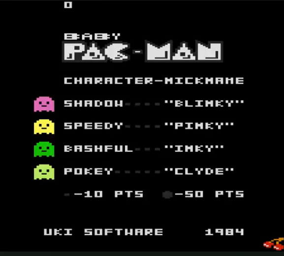 This is an odd game. The yellow ghost "Speedy" is nicknamed "Pinky". See what we are dealing with here? Are these people funny or do they just not care? There are several differences between this odd hack and the UKI computer game you have never played. The graphics are better here than in the computer version, and it shares the exact music with the 7800 version of Ms. Pac Man. The original game features no ghost box (the ghosts start out in the corners), the sound effects sound like different types of high pitched farts, and it features only one maze. BUT... that maze IS pretty cool looking, and not featured in the 7800 version. The original game maze is horizontally longer than tall, while the 7800 version's mazes are shaped like a conventional arcade Pac Man game (tall instead of wide). Also, in the original title, Baby Pac Man changes into iridescent colors when he eats a power pill... the ghosts stay the same color.