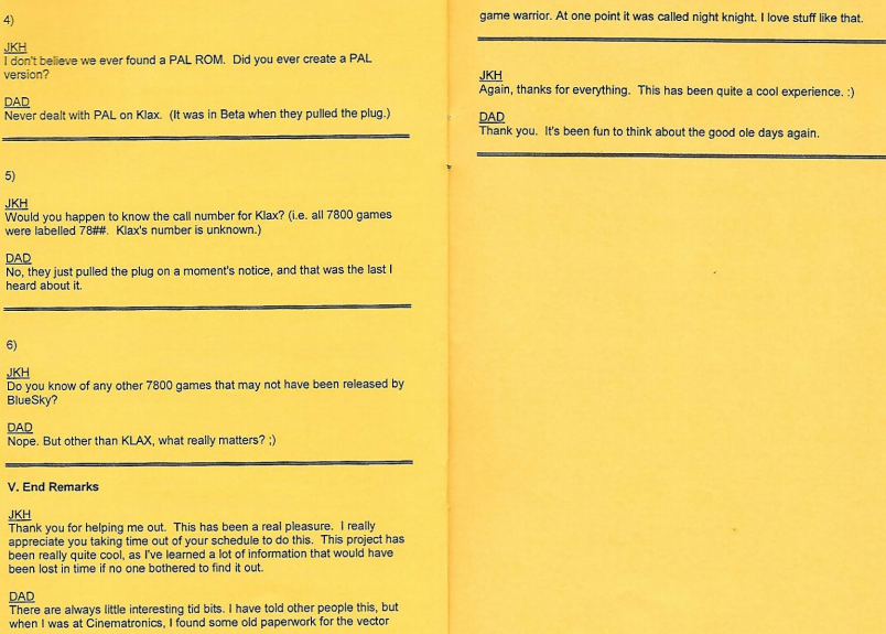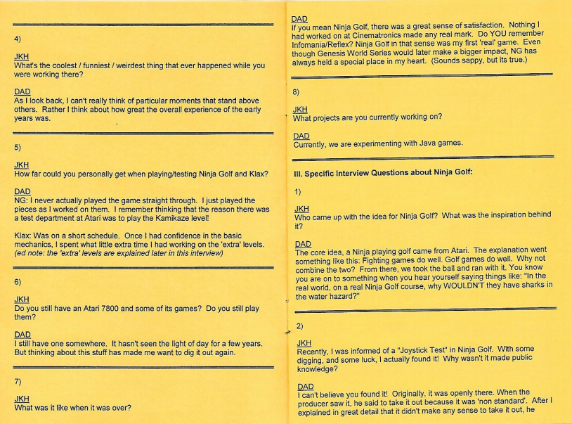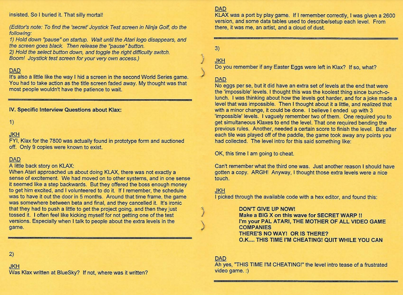By the way, kids... you know you are a programming pimp when you sign your name in gold ink on the boxes. That's when you know. Anyways, this is an old interview between my old collaborator John K Harvey and David A Dentt, the guy that programmed Ninja Golf and Klax for the Atari 7800. This interview surfaced when Lee Krueger of ResQsoft released Klax, a completed but unreleased prototype for sale through his website in the early double aughts. I've been searching for the image of Dentt's autograph and the interview for months and found both on the same day... so bully for me (thanks to John for finding the interview). This is a great little Q & A and exposes some secrets and facts about Klax and Ninja Golf that you should find interesting.