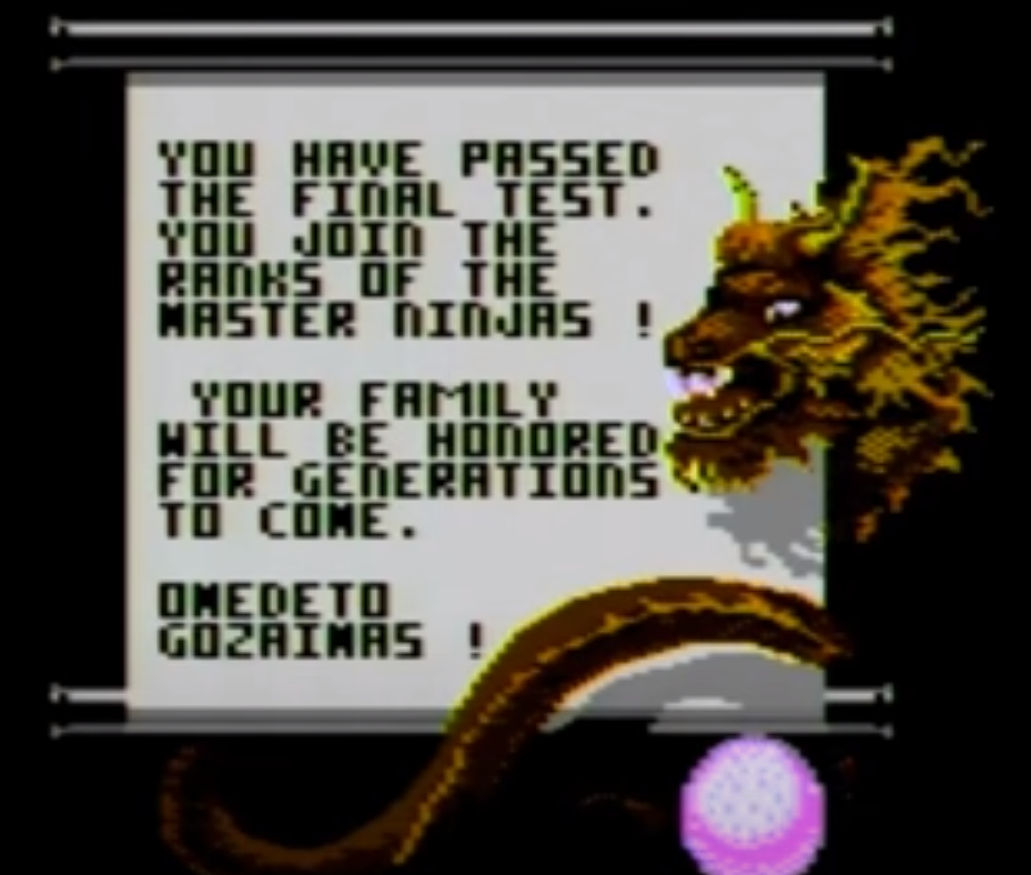 After the dragon at the 9th hole slinks off in humbling defeat, you are treated to your golf score and a message stating that you are now a Master Ninja. The Dragon head looks really great, but the playing of the Marine's Hymn over the ending of a Japanese style end screen is just stupid.