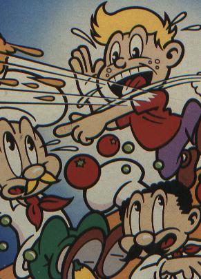 Gameplay: Here is the strong point to the game. Food Fights are just plain fun, and in this game you don't have to feel guilty as mom cleans up after you. Plus the game play is very simple and easy to pick up. You control Charley using the joystick. He will automatically grab food as he passes over it where it will appear in his hand ready to fire. You start walking towards your target chef of choice...press fire to toss. Smack! one chef out of the way!