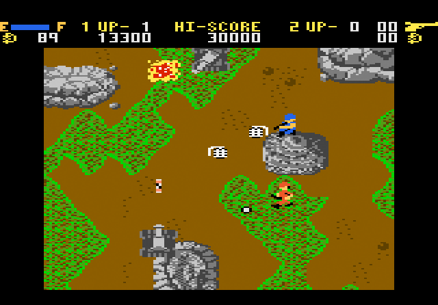 Sound: The music is so random in this game, it is funny. Sounds like a cat on the Casio keyboard. The sound effects are decent, except for the helicopter's. The explosions sound extra crunchy and nice. Fair effort here, but it can't compete with Commando's pokey chip audio.