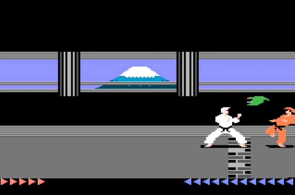 As far as final boss stages go, this is one of the toughest around. If you remember one vital fact about a Karateka's offense, you will remember that a Karateka can deliver 5 attacks in a row. Now compare that to your Hit Points. Yep, you can be taken out in one good combo. Couple that with the fact that birds are still flying around, you are in some deep doo-doo. Well, one good thing is that Akuma is still an idiot.