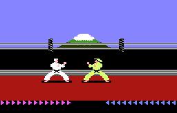 Graphics: The main gist of this game is one on one combat. So it would be important for the fighters to look good. And, considering the time this game came out, its not great. On the bright side, the karate moves look like real karate attacks, but they are so slow its impossible to take the look of this game seriously. Though these guys are not very detailed (i.e.: the characters do not even have faces) they come complete with karate garb and bad guys have big fancy hats to make them look more sinister. The backgrounds are pretty good. Whether you are breaking into the compound or deep within the castle's guts, Mount Fuji can bee seen in the distance. The brightest spot visually comes from the forlorn, imprisoned damsel in distress as she nervously paces in her prison. She actually looks feminine and moves with grace in her cutscenes. These girlie graphics are a big step up from Beat 'Em and Eat 'Em!