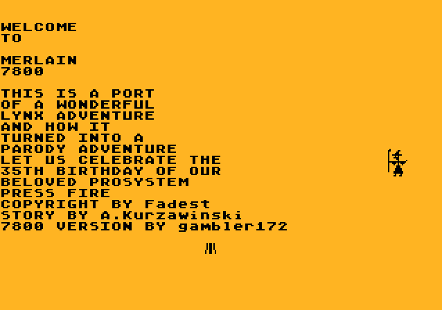 Overview: Atari 7800 programmer Gambler172 is into making book carts... What is a book cart, you ask? It's not that complicated. From what I can tell, it is not really a game, but just a program with different screens that display text and/or simple graphics. It can be a story (like his Journey of Snail), it can be a hodge podge of interviews, information, trivia games, etc (like his ET 7800 Book Cart) or, what is the most exciting to me, a Choose Your Own Adventure style story where you guide the narrative by making pivotal choices in the game. With Merlain 7800, the later is what you get.