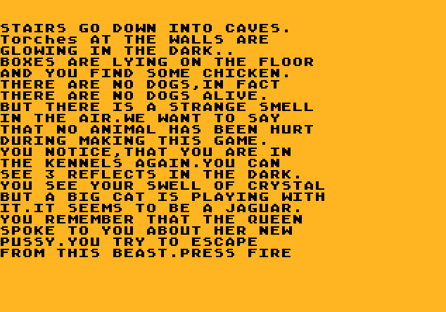 This "parody adventure" is an odd one. You wake up on a boat... queasy... but really you are in your bed. You are sick, and one of the earliest gags is that you vomit upon yourself. The story changes as you wander through the castle of Gamealot (groan), where bad grammar and inside jokes took me out of the experience repeatedly. If I created one of these text adventure games, I would do an adventure where I was attacking bands of theives and riding horses, not looking at carrots on the kitchen table. This is one reason I had a hard time getting into Merlain, I guess. I did like how one ending abruptly stopped the story and an evil woman makes you have to turn off the system to continue playing. That was a good idea, but I did not do as she requested.