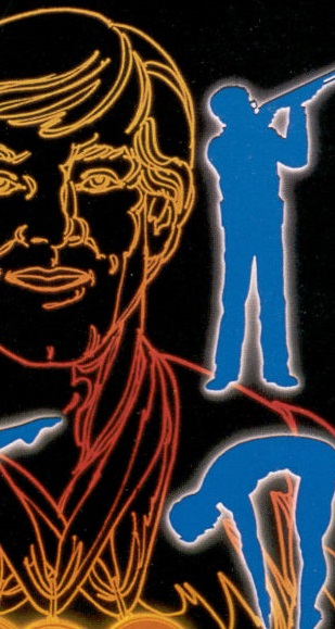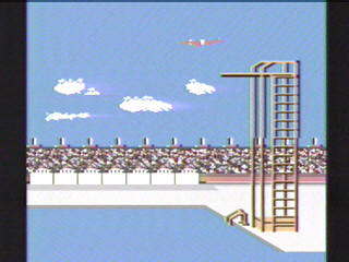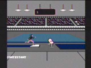 Graphics: The strengths of Winter Games and Summer Games are the excellent background and arena graphics. They both feature the identical opening ceremonies, as well as the very impressive country select screen that features several countries' flags, each rendered well. Unfortunately, it also features the lame yellow on baby blue game menus as Winter Games. The visual problems really heat up when the athletes appear. The divers/ swimmers look like match stick men, and the runners' animations tend to look very choppy and blob like. The grandstands during the running events event feature the crowd flipping cards that spell out USA...even if the participants are from Russia and West Germany (Remember those days?). The graphics during the gymnastics portion of the game are actually pretty good, but "Gymnastics" is really just"The Vault", and the lady looks like she is running in slow mo. BUT! it looks like an actual human being is participating in an event....not some kind of short circuiting robot.