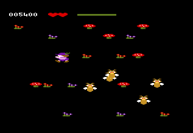 Graphics: The strong point of this game is absolutely the graphics. Wasp! must be some sort of hack of Robottron, because each stage opens with that trippy 3D tunnel/ Doctor Who wormhole gimmick. This always looks cool, but may be out of place for a game about some weird elf kid trying to score shrooms around flying insects. The wasps in this game kinda look like bees, but I'm no entomologist, so Im not sure. The protagonist in the game is a cutesy elf or electronic Hummel doll, and the playfield has near-Nintendo quality red mushrooms and purple and red sprigs of flowers. Sprigs is always fun to say.