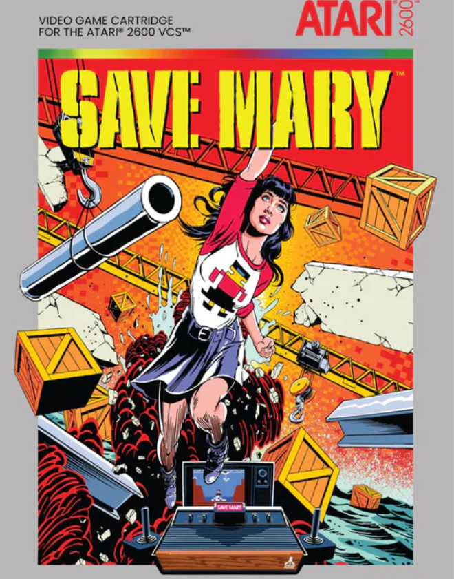 Unreleased Atari 2600 prototype "Save Mary" was discovered years after the 2600 was pronounced dead. It was a good puzzle game that was unplayable on a 2600 system due to internal bank switching issues. But clever kids with them big brainz discovered how to make this problematic 2600 cart playable by releasing it as a 7800 title... to the delight of dozens worldwide. It later got more pub by being featured in the plug n play Flashback 2... increasing the "Save Mary" fan base to even more dozens. Filled with chivalry, excitement, the toxic patriarchy, and/or lust, artists from all over started creating "Save Mary" box art by the truckload. And by truckload, I mean like eleven or twelve. Now, Atari themselves have gotten in to the act with MULTIPLE covers. Some of the box art is bad. Some are terrible. A couple are kinda cute. Here... I will mock them to the delight of even less dozens.