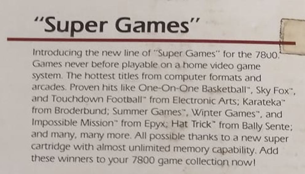 That's right! It was just a marketing ploy. Some folkies have thought it had to do with game memory, computer ports, super fancy schmancy games, bank-switching, graphics, but all of these titles under the "Super" moniker all hail from different origins and and have different tech specs. The smallest Super Cart was 32k with no RAM. The biggest were Winter & Summer Games with 128k and 16k RAM. Hat Trick is an arcade game. Karateka is a terrible computer port. Desert Falcon is an original IP, etc. See? Nothing consistent. Funny enough... some of the "Super Games" are the worst in the library. Here is some double speak Atari published on the back of the 7800 console box that is probably responsible for the mystery.